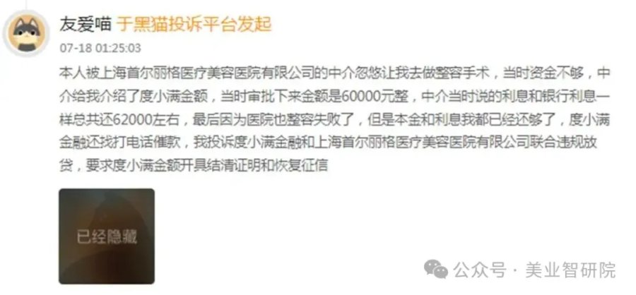 在黑猫投诉平台上,有多起关于度小满金融和上海首尔丽格医疗美容医院有限公司中介联合违规放贷的投诉案例,让人触目惊心。