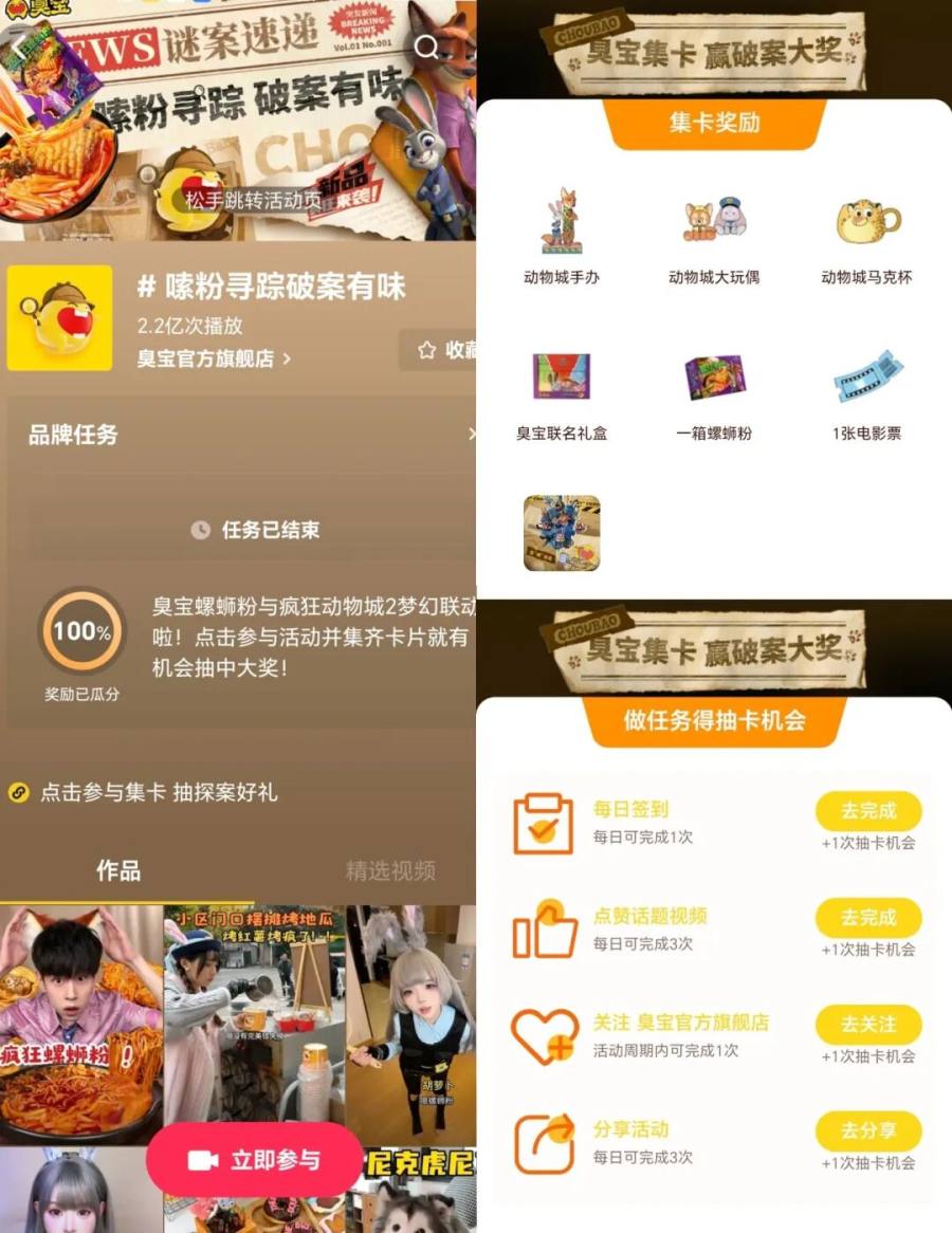 在广泛“撒网”各个社交媒体的同时,臭宝也精选了抖音阵地进行重点突破。在这一用户创作热情高、IP影响力强、后端转化链路成熟、品牌持续深耕的阵地,发起了“臭宝全民寻踪集卡”任务。鼓励用户通过签到、发布相关创作、参与话题互动等玩法,赢得抽取线上卡牌的机会,并通过集卡获得IP周边、合作款产品等礼品。