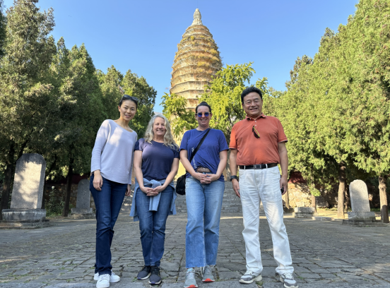 嵩岳书香传四海中原文脉耀千秋——张国臣、张小羽向美国佛蒙特法学院院长贝丝.麦科马克(右二)、副院长凯蒂.梅里尔(左二)介绍世界文化遗产嵩岳寺塔文化(2023年10月 王素珍摄)
