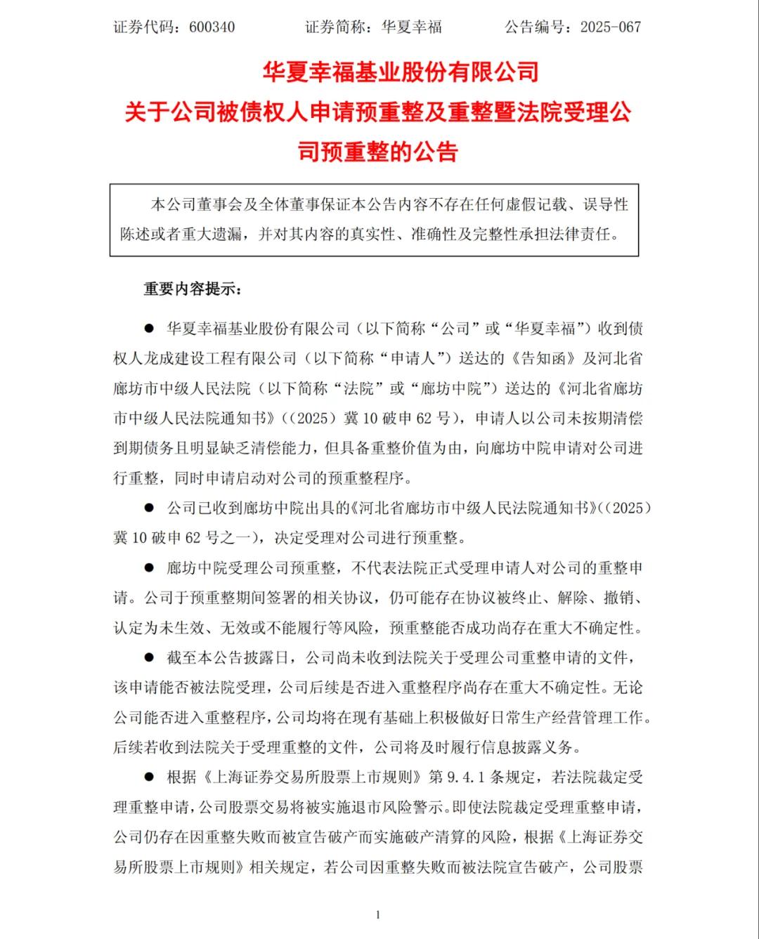 11月17日,华夏幸福公告称,收到河北省廊坊市中级人民法院送达的《通知书》,债权人龙成建设工程有限公司,向河北省廊坊市中级人民法院申请启动华夏幸福重整及预重整程序,目前法院已受理。华夏幸福在公告中强调,“对预重整无异议”。