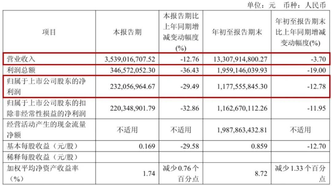 2025年前三季度,其营业收入133.08亿元,同比下降3.70%;归母净利润11.78亿元,同比下降12.78%。其中净利润降幅高达29.49%,创下近年单季度最大跌幅。