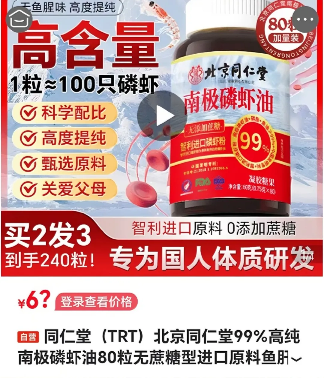 然而2025年末,一则检测结果让这二十字箴言沦为讽刺——一款标称“北京同仁堂99%高纯南极磷虾油”的产品,经权威机构检测,核心成分磷脂含量竟为“0”,所谓的“高含量”“1粒≈100只磷虾”“高度提纯”“智利进口原料”全是虚假宣传。