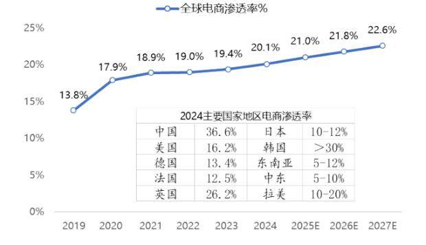 全球电商渗透率持续提升,但区域市场增长特征分化: