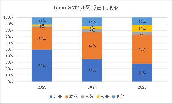 在此背景下,Temu的全球布局趋于均衡:在稳固北美、欧洲等发达市场的同时,加大对东南亚、拉美等新兴市场的投入。从GMV看,美国占比已降至不足三成;月活用户分布更为均匀,亚洲、南美等高增长区域份额持续扩大。