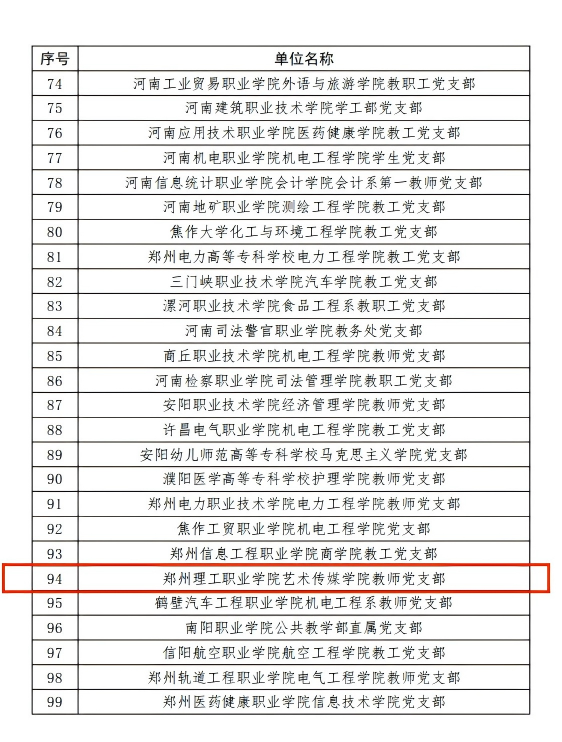 近日,河南省教育厅发布关于全省教育系统党建强基引领“三级联创”及第三批全省高校“双带头人”教师党支部书记工作室评选结果的通知,郑州理工职业学院艺术传媒学院教师党支部凭借扎实的党建工作基础、突出的育人成效及鲜明的特色优势,获评“全省高校党建工作样板支部”培育创建单位称号,这是该校党建工作取得的又一重大标志性成果。