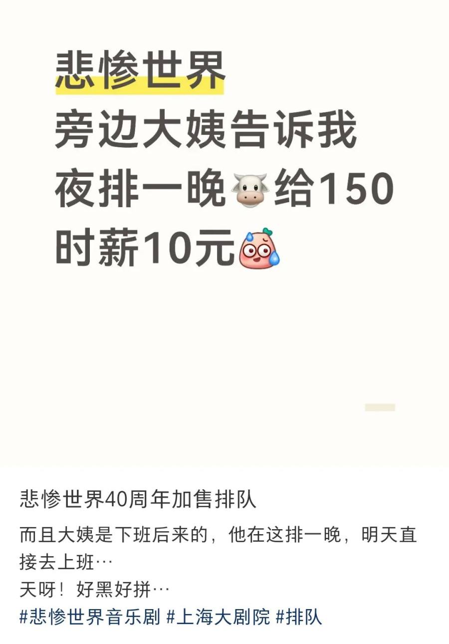 剧院后续加开的数百张加座票更是引发观众连夜排队抢购,一些黄牛甚至组织大叔大姨带着椅子、帐篷夜排抢票。有剧迷问到这些大叔大姨排队一天的雇佣费用通常为100-150元,而黄牛能赚到的门票溢价远远超过大叔大姨们的“劳务所得”。