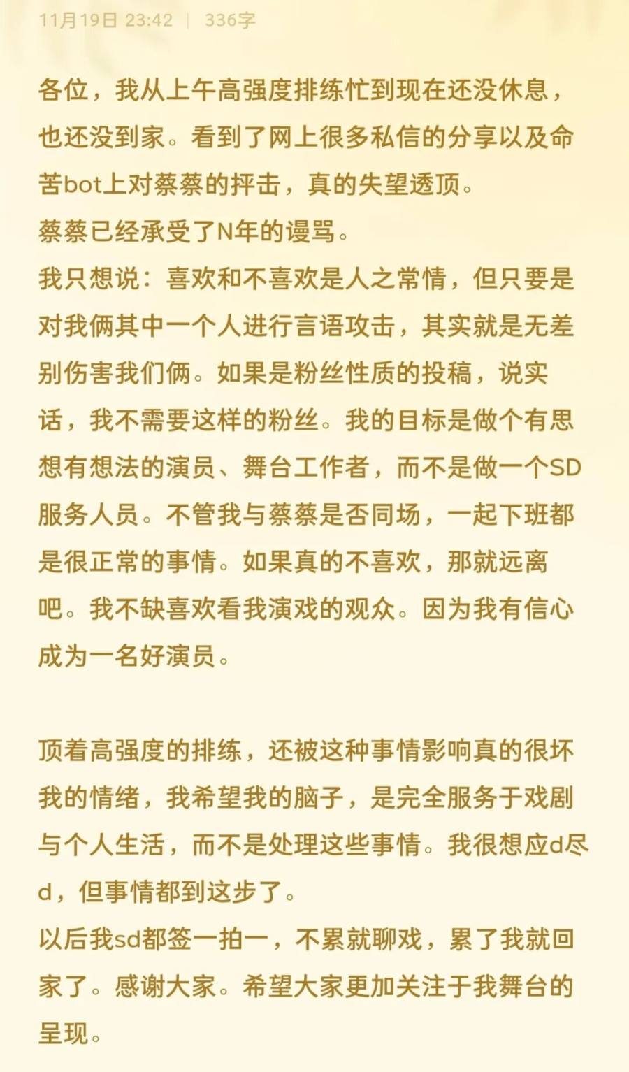 11月19日,中国音乐剧演员徐佳文在小红书上发帖,回应SD时与同为剧场演员的女朋友一起下班时的争议,希望“各位都活在现实当中”,贴文中提到“我的目标是做个有思想有想法的演员,舞台工作者,而不是做一个SD服务人员”,希望观众能够“更加关注于我舞台的呈现”。