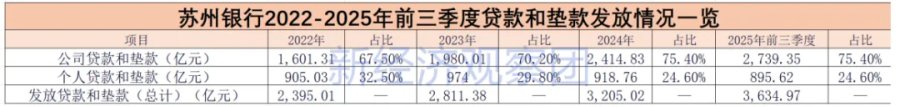 从贷款结构上看,2022-2025年前三季度,苏州银行公司贷款占据大头,占比分别为67.50%、70.20%、75.40%和75.40%,逐步走高,也意味着对对公业务的依赖继续增强。同期,该行个人贷款业务占比逐渐降低,从2022年的32.50%降至今年前三季度末的24.60%,余额也收缩到900亿元之内,为895.62%。这与很多以零售业务见长的江浙沪银行风格迥异。
