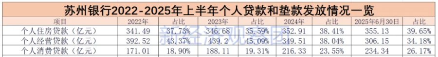 其中,个人住房贷款占比从2022年的37.73%增长至2025年上半年末的39.65%,仅微增;个人经营贷款则下降明显,占比从2023年高点的45.09%下降至上半年末的34.18%,降低超10个百分点。2025年上半年,苏州银行个人住房贷款355.13亿元,较上年末增长0.63%;个人经营贷款306.15亿元,较上年末下降12.41%。