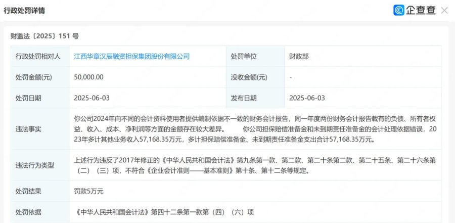 今年6月,华章汉辰融担因“2024年向不同的会计资料使用者提供编制依据不一致的财务会计报告,同一年度两份财务会计报告载有的负债、所有者权益、收入、成本、净利润等方面的金额存在较大差异”等问题被处罚5万元。