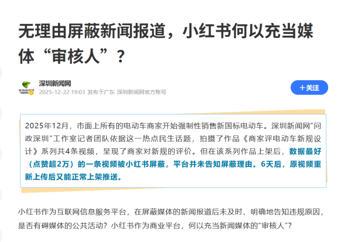 深圳新闻网质疑小红书"越权审核",合规电动车新规报道遭无理由屏蔽,内容平台权限应该多大?