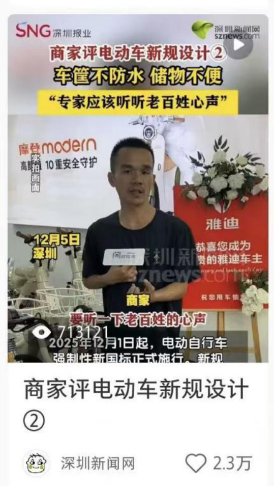 12月6日,该媒体旗下“问政深圳工作室”策划拍摄的视频报道《商家评电动车新规设计:车筐不防水,储物不便,专家应该听听老百姓心声》在小红书账号发布。报道从电动车商家实际经营视角出发,反映了2025年12月1日电动自行车强制性新国标施行后,车辆在车筐防水性能及储物实用性方面存在的不便之处,并传递了商家希望“专家多倾听民众心声,推动电动车产品优化完善”的诉求,该视频获得了2.3万的相关关注度。