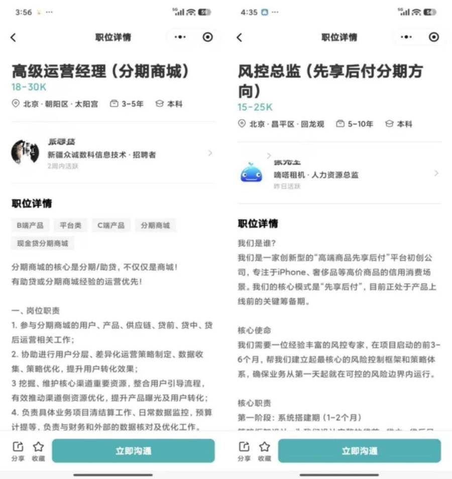例如,新疆众诚数科在高级运营经理(分期商城)的职位详情中特意指出:分期商城的核心是分期/助贷,不仅仅是商城!