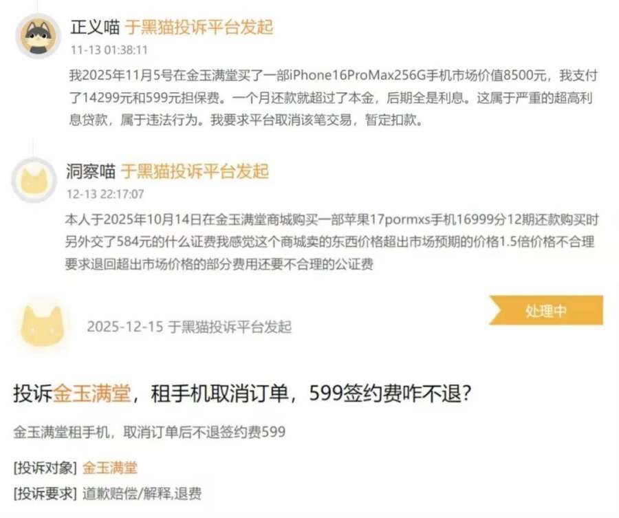 另有用户表示:本人于2025年10月14日在金玉满堂商城购买一部苹果17 pro max手机,16999分12期还款,购买时另外交了584元的公证费。感觉价格超出市场价1.5倍不合理,要求退还部分不合理费用。