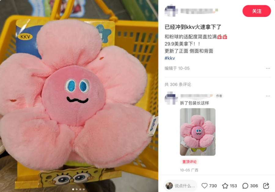 上述引起共鸣的IP联名系列,正是来自海绵宝宝与KK集团旗下全球潮玩集合品牌X11的联名新品“比奇堡路人鱼毛绒盲盒”,一经推出便引发全网疯抢;而在KK集团旗下另一品牌KKV,围绕生活方式,与海绵宝宝推出的“比奇堡的居民们演我一天”IP联名产品,亦同样受追捧,引发粉丝“玩梗式”种草。海绵宝宝与KKV共创的多个生活周边产品,均出现了超预期的销量增长。