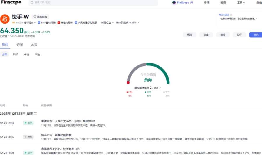 这一质疑也传导至资本市场,12月23日,快手开盘下跌3.3%,开盘后跌幅进一步扩大,一度下跌5.7%。