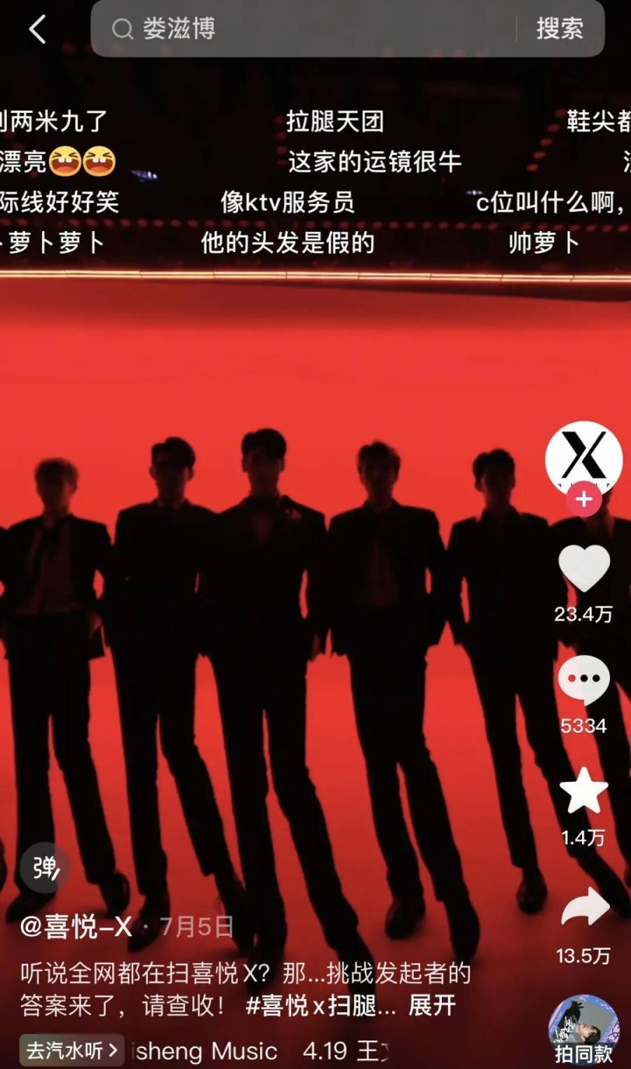 2024年,喜予文化开始组建团播,定位“大叔系”的喜悦023直播间成为了积累声量的起点。2025年成为喜予文化的爆发年,4月中旬,喜悦X正式成立,前《偶像练习生》选手娄滋博(萝卜)带着选秀标签加入X,自带话题度让团播出圈。同年6月,喜悦X通过与头部网红皮皮朱的联动直播,直播间观看人数和流量飙升,发起“扫腿舞”全网走红,彻底将喜悦X推上顶流位置。