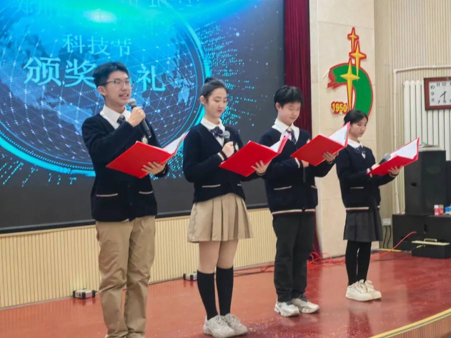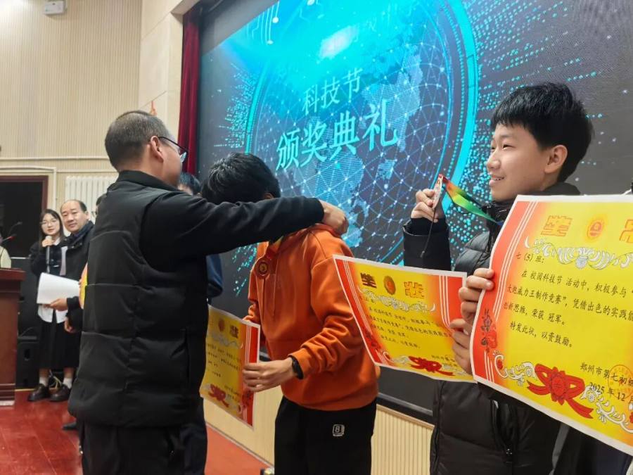 12月19日,郑州市第七初级中学成功举办了一场别开生面的校园科技节,本次活动以“趣味表演为媒,学科创意为翼”,为全校师生带来了一场集趣味与科创于一体的精彩科技盛宴,本次活动在闫凯校长,王伟明副校长带领下,由罗莹莹老师总负责,王圆、郑云、李娜、赵志会老师分负责,音乐李昭、袁晶老师协助选拔,三位年级长助力,理化生全体老师和班主任共同帮助。活动当天,郑州市第七初级中学校长闫凯,副校长王伟明、曾雷鸣、王东伟,以及办公室主任曲范州、教师发展中心主任魏丽丽、学生发展中心主任李少峰、办公室副主任张召静等领导莅临现场,与师生们共同见证了这一科技与创意的盛会。