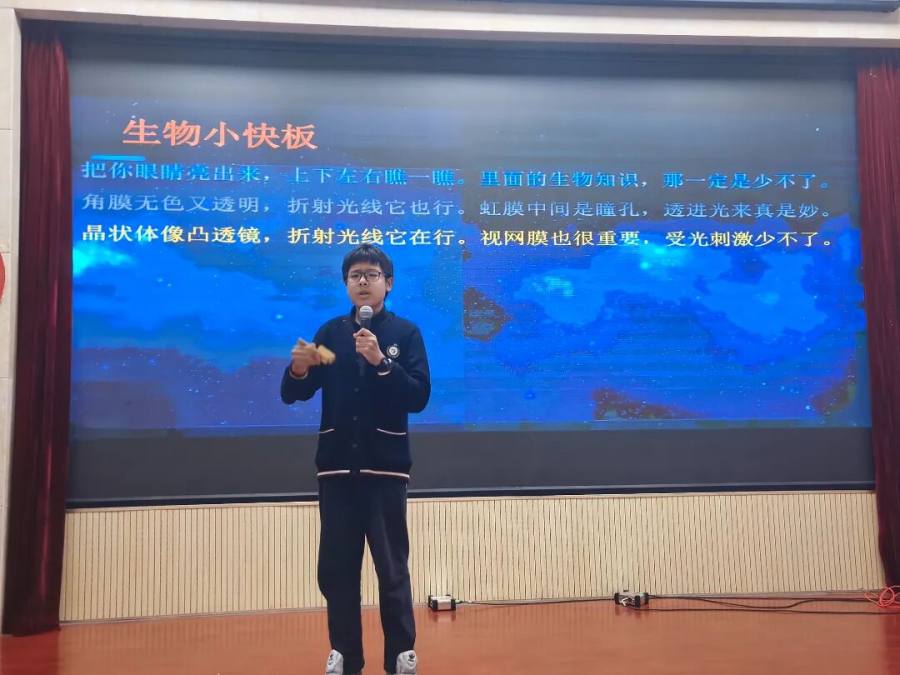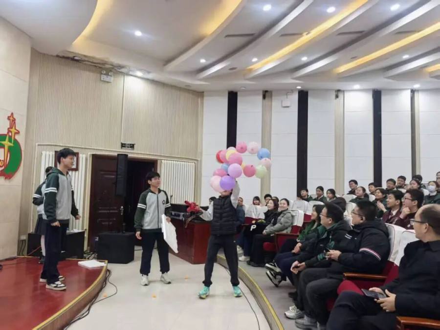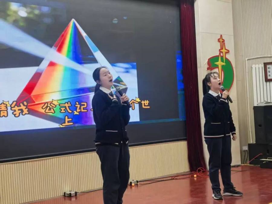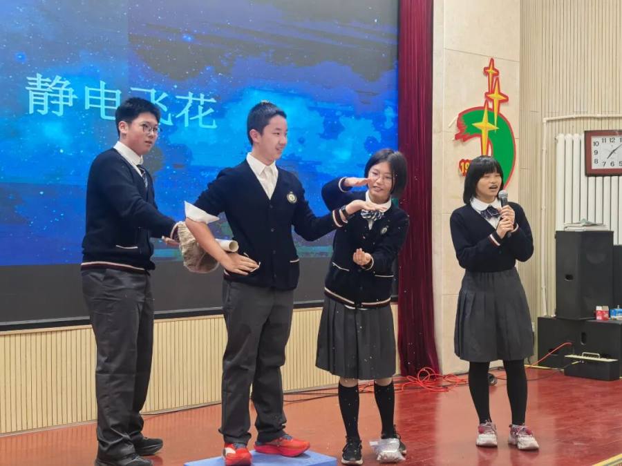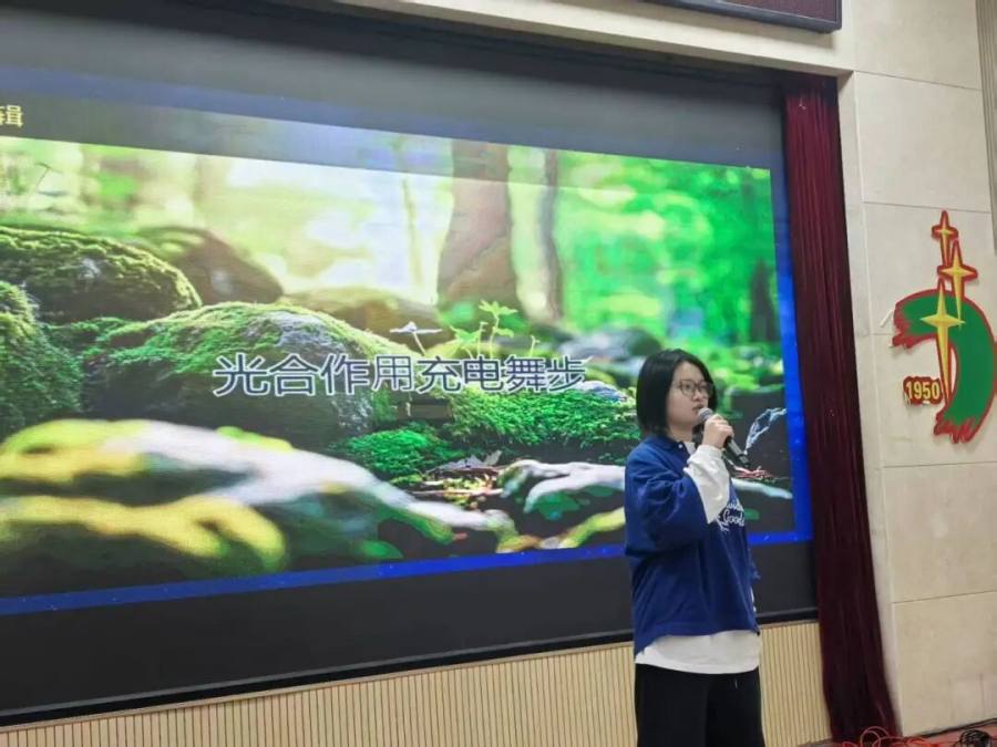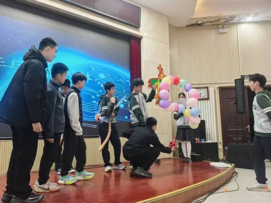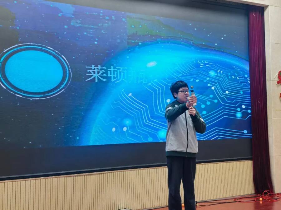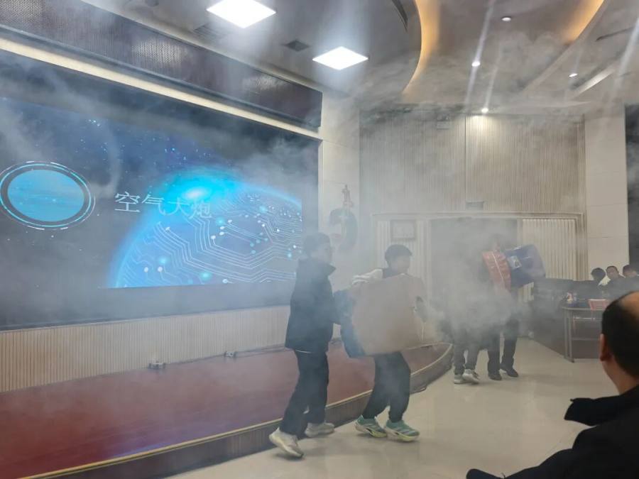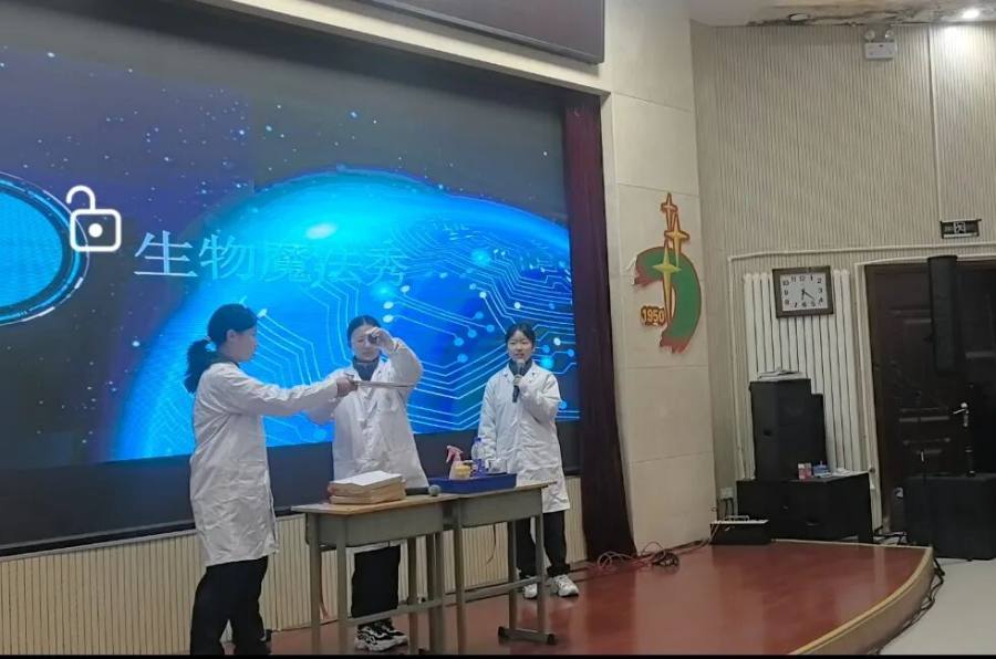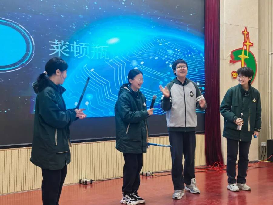 科技秀现场,节目精彩纷呈,创意无限。首个表演“气球摩天轮”以其童趣与巧思吸引了全场目光,灵动气球搭配创意设计,尽显科创巧思。随后,九十二班师浩翰的独唱《teeth》用歌声点燃了全场热情,科学实验表演环节更是将活动推向高潮,充满视觉冲击的“火焰掌”表演震撼来袭,“乒乓球加特林”实验则通过压缩空气发射乒乓球击打目标,联动引瓶放电,展现了科创的硬核实力。生物魔法秀、生物rap等表演也通过趣味方式解锁了生物学科的奥秘,学科创意歌曲《化学里香》《苦茶子》及电功率主题创意表演《电功率卿》则将科学知识融入艺术,彰显了跨学科融合的魅力。