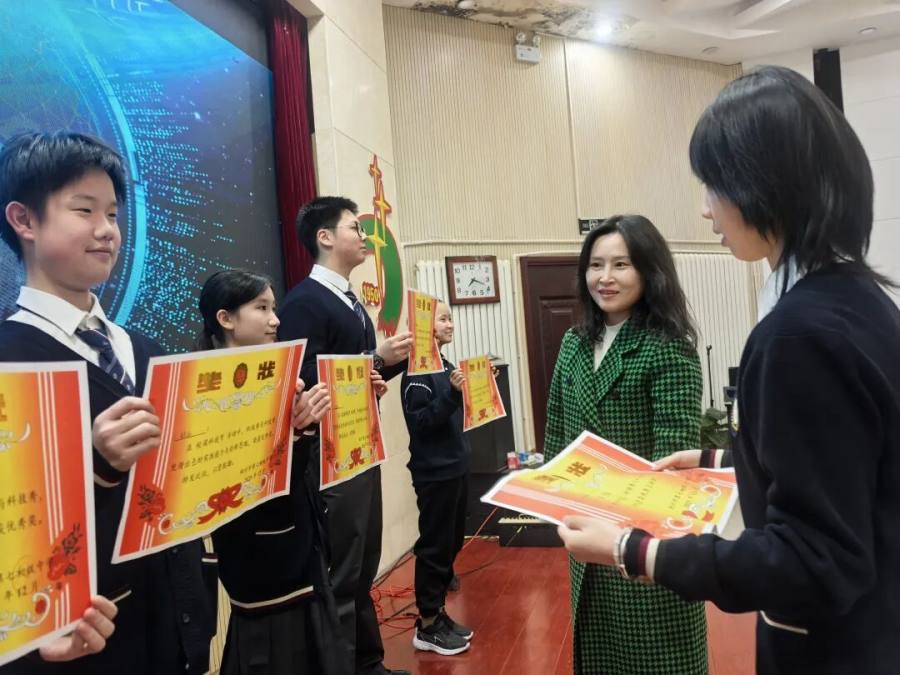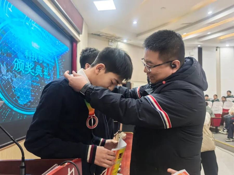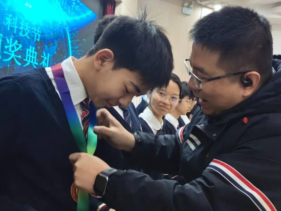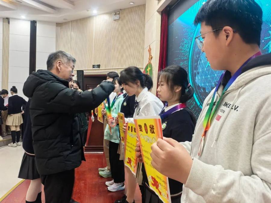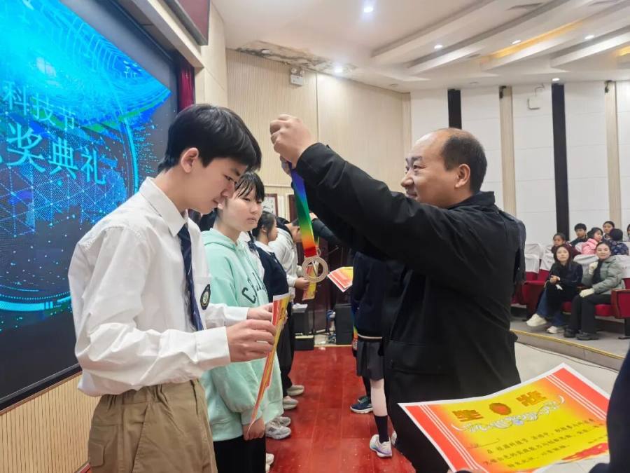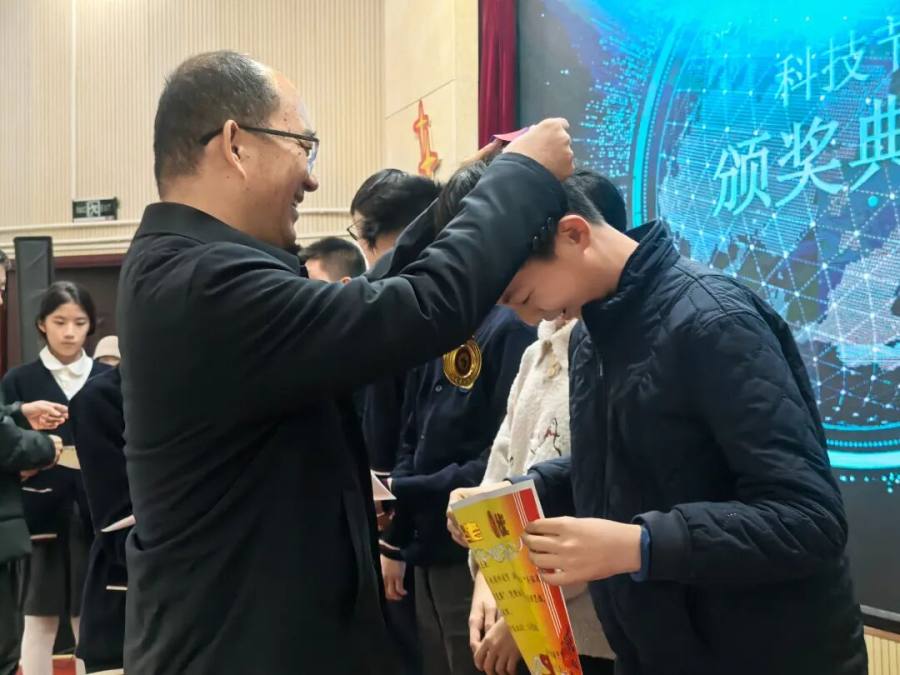 在颁奖典礼环节,校长闫凯为获奖学生颁奖并深情寄语:“科技是点亮未来的火种,希望同学们永葆这份探索热情,让创新思维成为人生最亮的底色,在科学道路上不断攀登新高峰!”随后,闫校长进一步勉励全体师生:“今日之创意,是明日之突破的萌芽;今日之探索,是未来之创新的基石。愿我们以科技为舟,以创新为帆,在时代的浪潮中勇立潮头,共同书写属于未来的科学传奇!”闫校长的讲话将活动推向情感高潮,既肯定了同学们的科创成果,更以“火种”为喻,激励全体师生以科技为炬、以创新为翼,在探索未知的征程中永葆热忱。