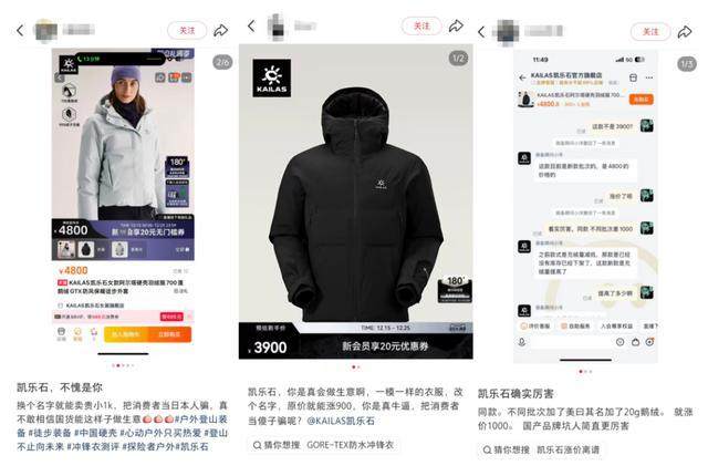 据报道,凯乐石已下架的喀纳斯羽绒服与新款阿尔塔羽绒服在外观设计、面料材质等方面高度相似,核心参数也基本一致,但官方原价从3900元攀升至4800元。