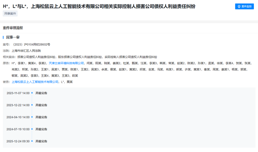 12月24日,天眼查显示,“松鼠AI”母公司上海松鼠云上人工智能技术有限公司(简称“上海松鼠云上”)及其法定代表人栗浩洋新增一则开庭公告。