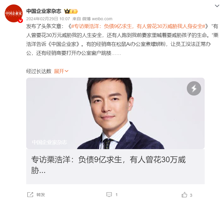 受“双减”影响,2021年7月,栗浩洋彻底关停了公司的教培相关业务,松鼠AI的月营收从七八千万元直接掉到了0。雪上加霜的是,因为过往松鼠AI的主要商业模式是与全国各地线下校外培训机构合作,向后者提供智适应SaaS系统和相关市场、教育服务收取使用费,业务的突然关停引发了经销商的学生退费潮,这让松鼠AI一下子欠下9个亿的债务,此外,还得再加上公司每月几千万元的亏损。
