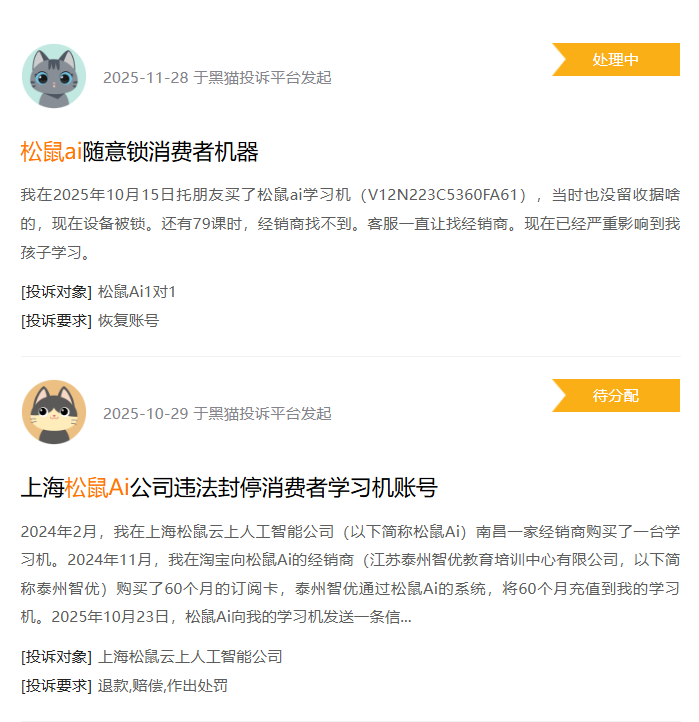 与此同时,这种经销商代理模式也存在一定风险。黑猫投诉平台上,有消费者投诉松鼠AI存在随意锁消费者机器以及违法封停消费者学习机账号的情况。