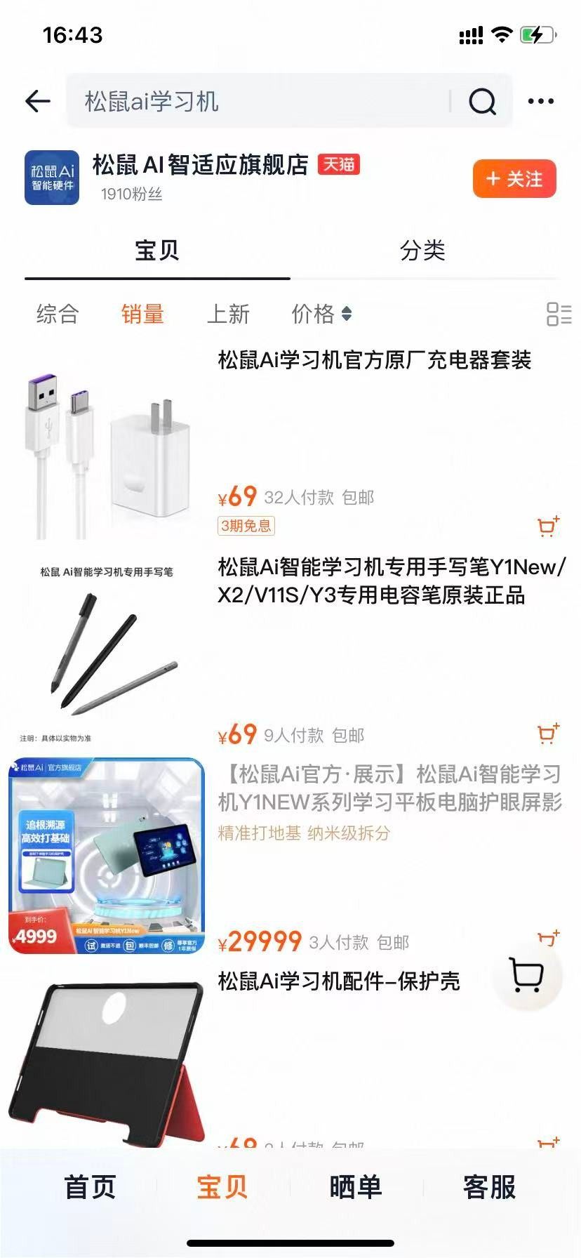 天猫平台上的“松鼠AI智适应旗舰店”,粉丝数为1910,店铺搜索页面显示,“近一年热销2万+宝贝”,但店铺页面显示,销量最高的产品是一款学习机官方原厂充电器套装,32人付款,其他产品付款人数不足十位数。其中,一款售价29999元的学习机仅有3人付款。