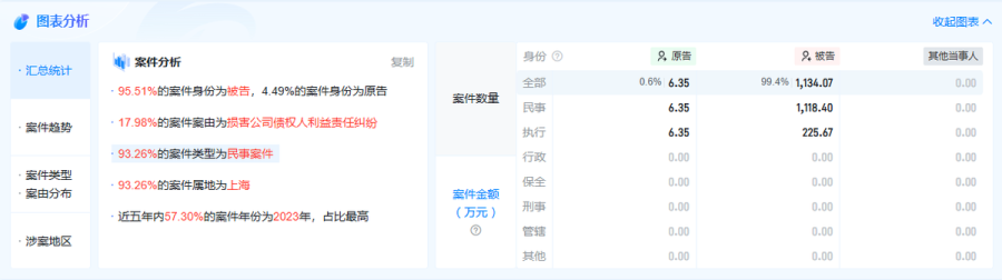 此外,上海松鼠云上涉及的司法案件共89件,其中95.51%的案件身份是被告,17.98%的案件案由为损害公司债权人利益责任纠纷,作为被告涉及的案件金额为1134.07万元。