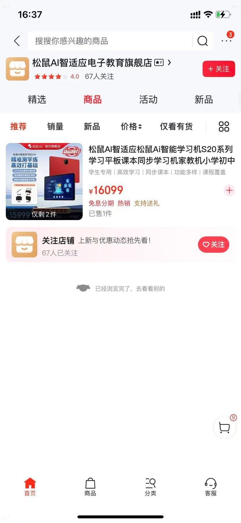 京东平台上的“松鼠AI智适应电子教育旗舰店”内,仅有一款产品,为学习机S20系列,已售一件。