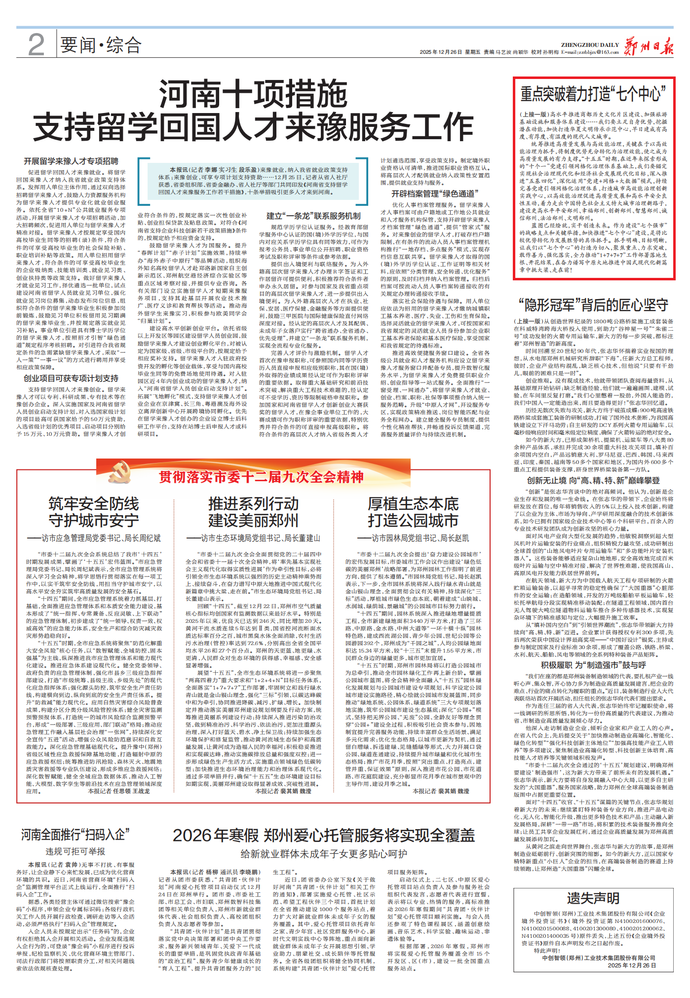 深入学习贯彻党的二十届四中全会精神,全面贯彻落实习近平总书记在河南考察时的重要讲话精神,深入贯彻落实省委十一届十次全会部署要求,市委十二届九次全会紧紧围绕国家重大部署,聚焦“两高四着力”,突出郑州独特优势、锚定发展迫切需求,明确提出要打造教育科技人才一体实践中心、新型工业化示范中心、区域金融中心、丝路枢纽中心、国际消费中心、华夏文明传承示范中心、城市高效能治理创新实践中心。