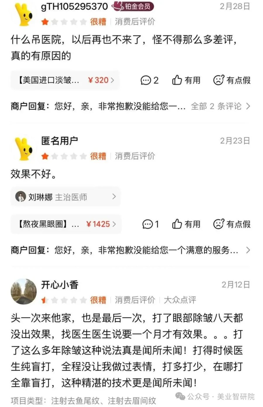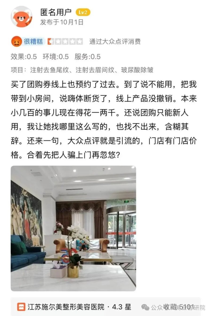 此外,在美团上,多名消费者怒斥江苏施尔美效果不好,难怪差评这么多,这不仅是头一次也是最后一次。其中一名消费者反映,在江苏施尔美做眼部除皱项目,八天无变化,医生却辩“一个月才起效”,违背常规除皱3~7天见效的医学常识。