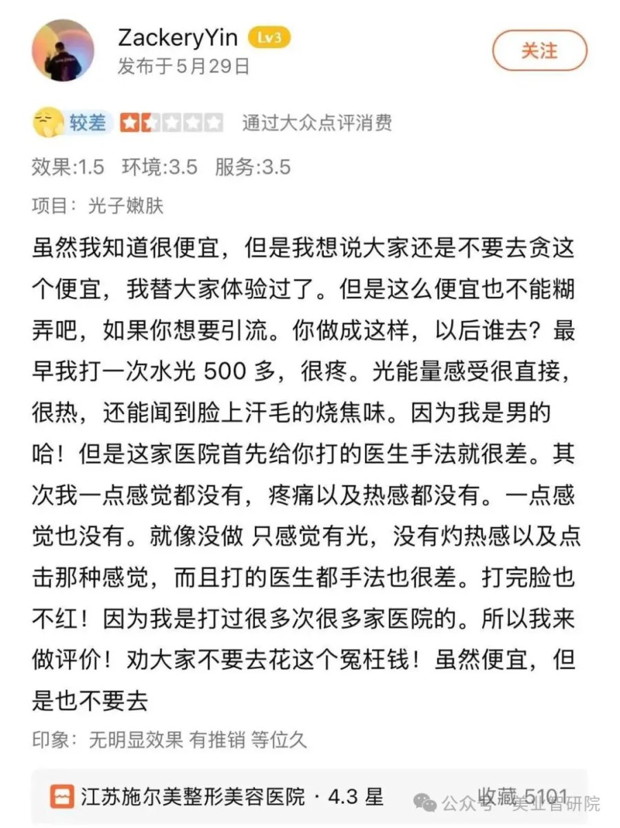 还有消费者凭多次水光经验对比发现,江苏施尔美虽标着“超低价”,实际医生手法拙劣、仪器能量明显不足。在做项目的过程了全程无刺痛、无灼热,连汗毛焦味都未闻到,术后脸不红,如同“假打”,一点效果都看不出来。
