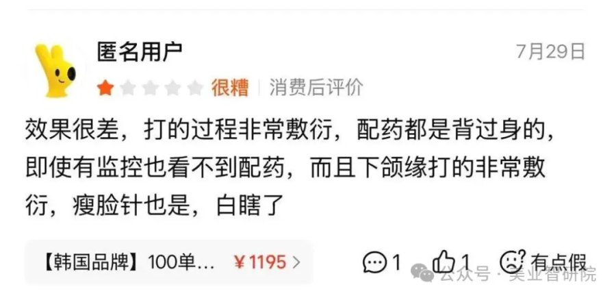 同时,还有消费者爆料江苏施尔美操作全程敷衍,不仅配药刻意背身遮挡、监控盲区难见真药,下颌缘与瘦脸针均草草几针了事,效果全无,涉嫌以暗箱配药、虚假注射欺骗消费者。
