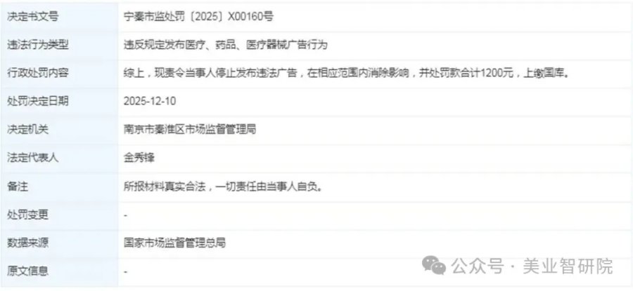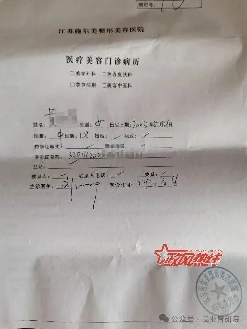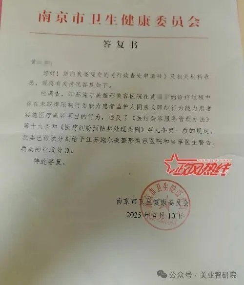 2025年4月10日,南京市卫健委调查后明确,江苏施尔美整形美容医院存在未取得限制行为能力患者监护人同意,为限制行为能力患者实施医疗美容项目的行为,违反了相关规定,依法对医院和当事医生给予了警告、罚款的行政处罚。