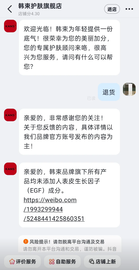 新识研究所就此事询问韩束护肤旗舰店铺,客服称:“韩束品牌旗下所有产品均未添加人表皮生长因子(EGF)成分,关于您反馈的内容,具体详情以我们品牌官方账号发布的内容为主。”