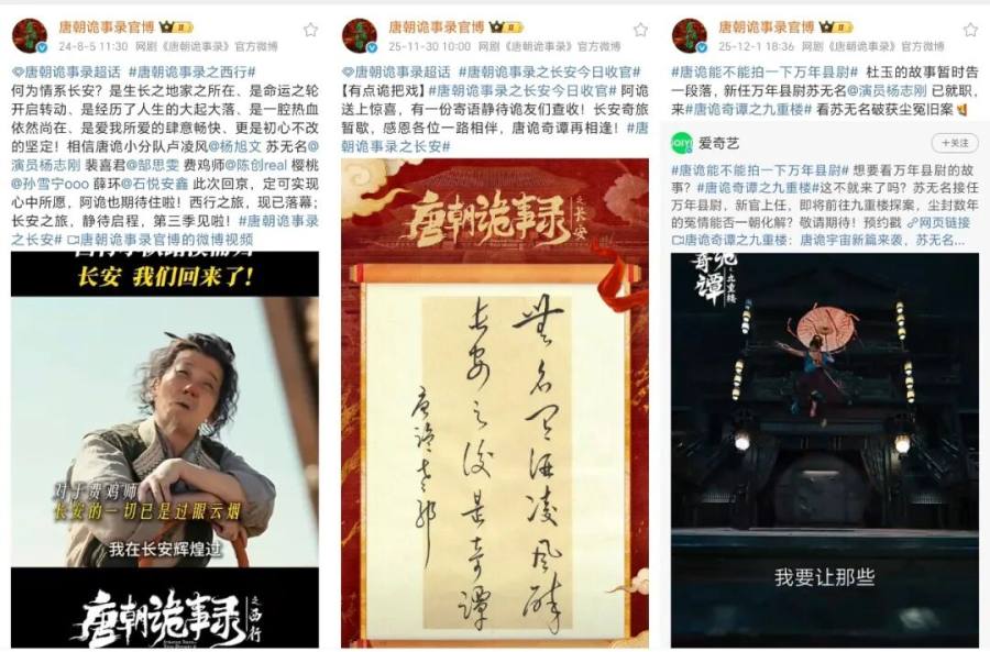 去年8月,《唐朝诡事录之西行》收官时,唐诡官微宣布“第三季长安见”;今年11月《唐诡长安》收官当天,官微也提出“长安奇旅暂歇,唐诡奇谭再相逢”的口号;12月《唐诡奇谭》播出尾声,唐诡官微打造出了“唐诡播完中剧播短剧”“唐诡2025最后一案来了”等热搜话题,丝滑将用户关注度导流至新一季短剧。