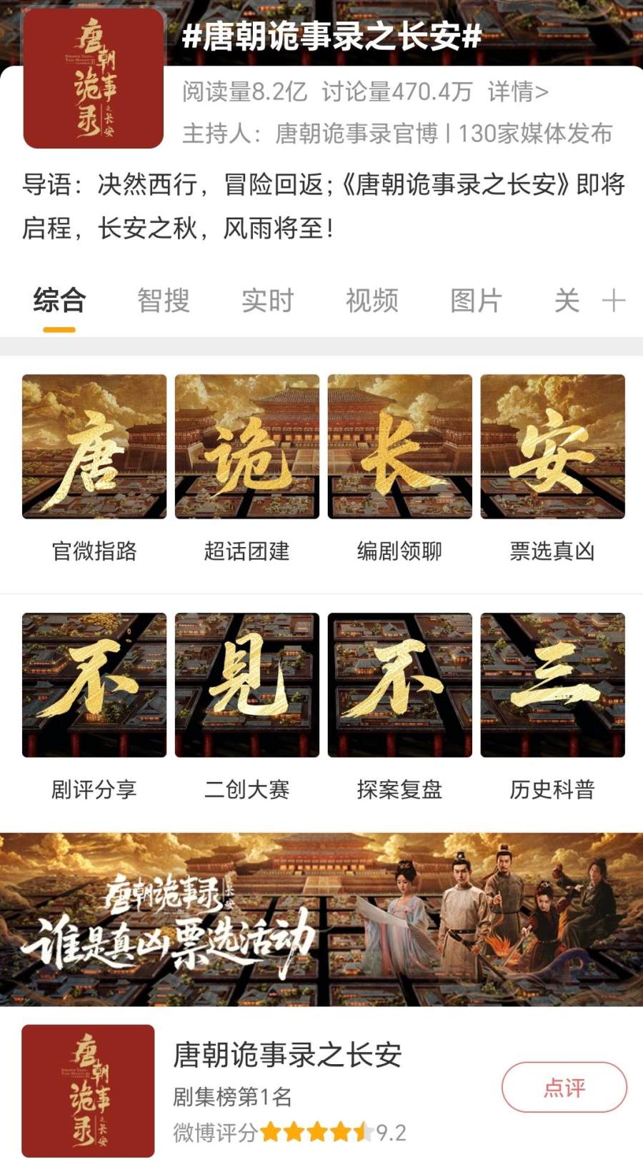 《唐朝诡事录之长安》的主话题内,官方设置了八大专区,剧评、案件复盘承载主剧情相关话题;历史科普一栏的历史向话题引发关于盛唐民俗的延展讨论;二创大赛、票选真凶调动剧迷深度参与,养成粉丝粘性。