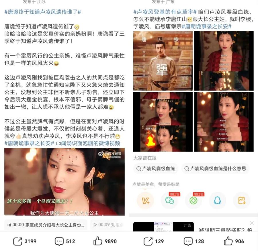 以吸人眼球的历史科普话题为例,《唐朝诡事录之长安》开播前,搭载关于太平公主“嫡嫡道道”纯血继承人的历史热议,剧集未播先火,“终于知道卢凌风遗传谁了”“唐犟宗李凌风”等串联起剧集和历史内容的趣味话题频频登上热搜,创造了第一波爆发流量。