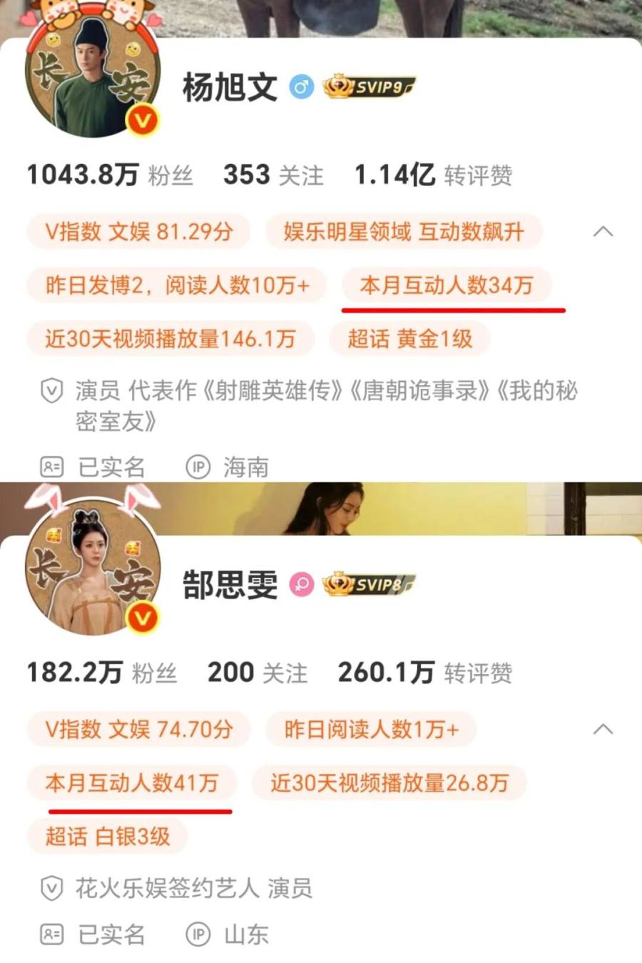 以《唐朝诡事录》系列为例,新一季内容播出后,小分队主演们借助角色光环,收获了个人热度和商业价值的新高峰。微博显示,主演杨旭文、郜思雯官方账号本月互动人数分别达到34万,41万,与粉丝交互紧密。