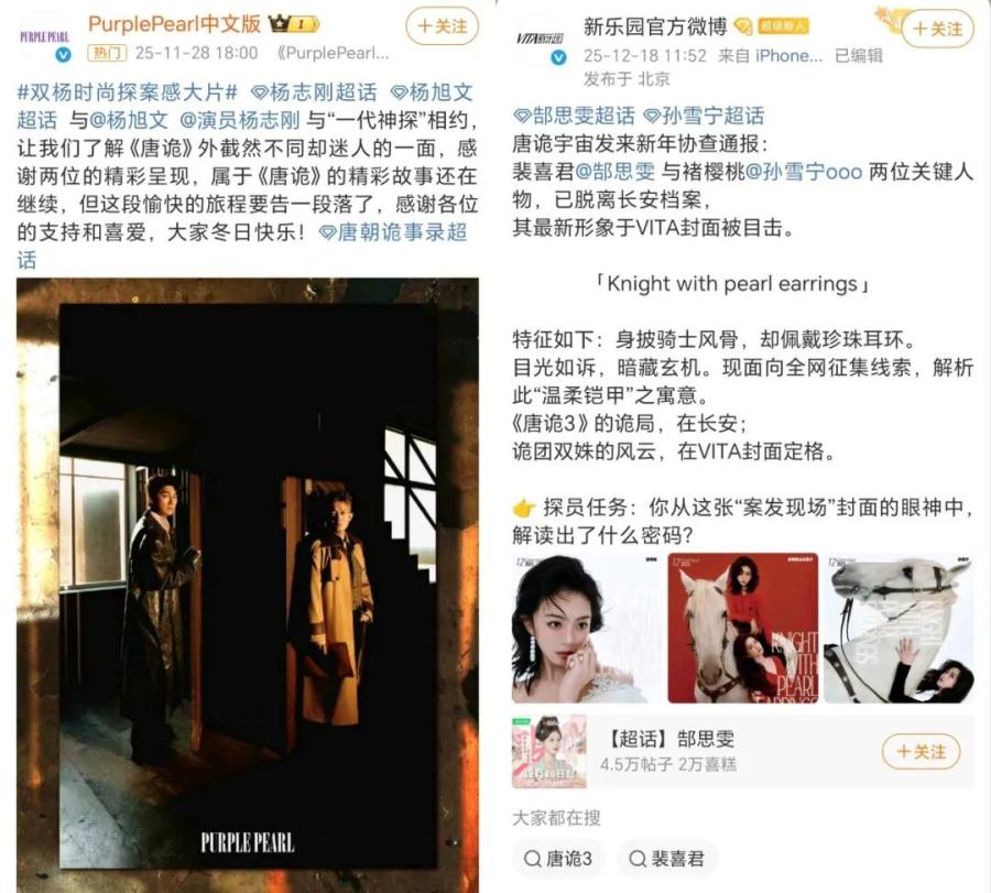 同时,唐诡一众主创也收获了密集的时尚资源。11月,杨旭文、杨志刚携手登上《PurplePearl中文版》封面,主题为“探案感大片”,正是对剧中卢凌风与苏无名师兄弟携手破诡案关系的延续。12月,郜思雯与孙雪宁合体拍摄《VanityTeen》《NYSTYLE》《VITA》等杂志封面,柔韧共生、双生绮梦等主题也与剧中唐诡双姝身份照应。