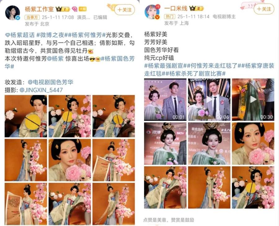 同样,今年1月11日的微博之夜,杨紫一身《国色芳华》中何惟芳的经典造型亮相活动,也带动了#杨紫最强剧宣#、#杨紫何惟芳穿越来微博之夜#等热搜话题,对《锦绣芳华》实现了有效剧宣。