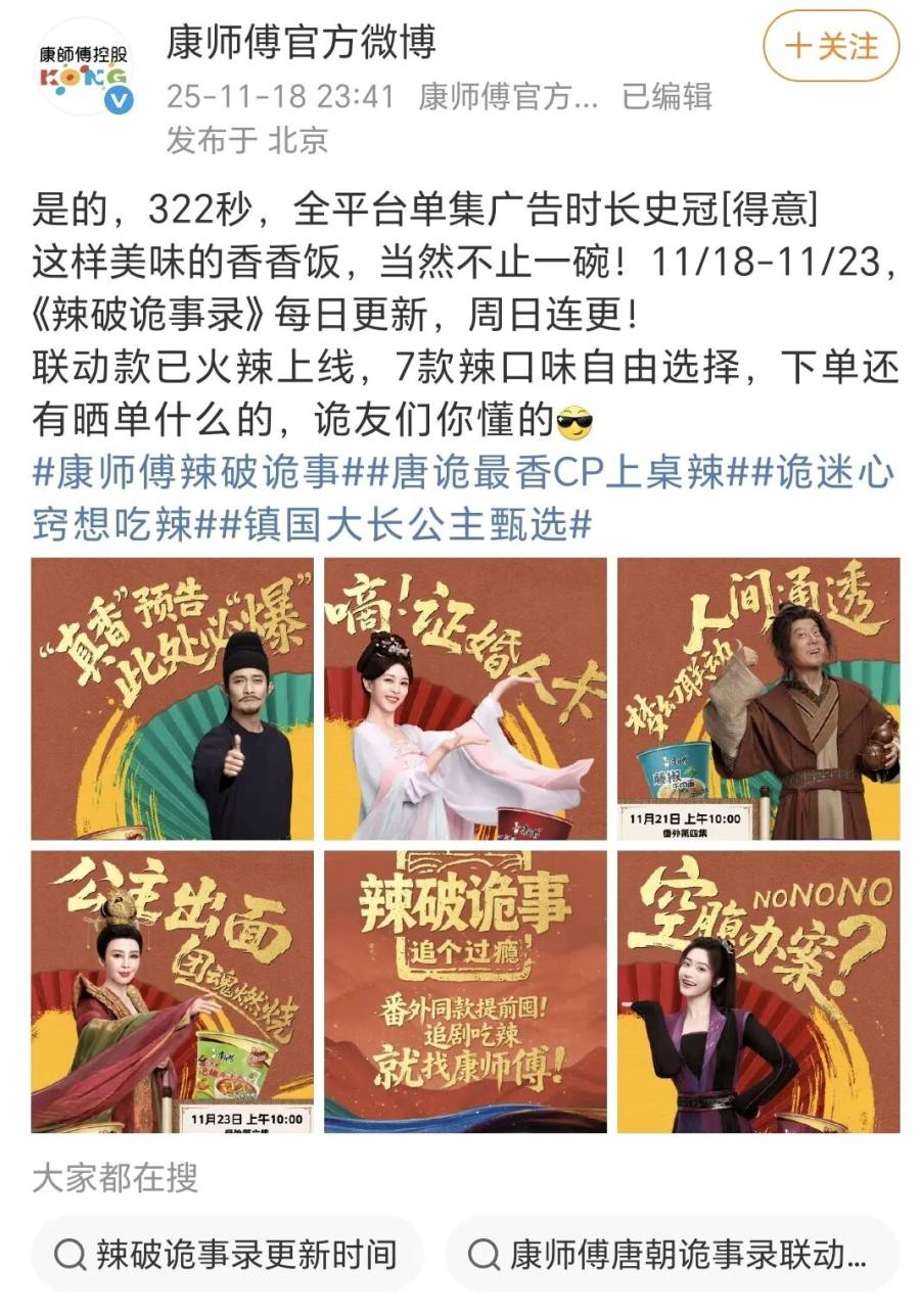 《唐朝诡事录之长安》剧播期间,合作品牌超35个。以康师傅为例,其化身为“唐诡最香CP”,联合原班演员推出7集短剧《辣破诡事录》,将康师傅面馆植入唐朝背景。借助与原剧高度匹配的制作和故事,大量观众收获了观看衍生番外的趣味体验。