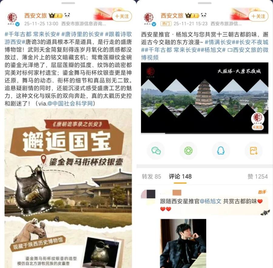 《唐朝诡事录之长安》《唐诡奇谭》热播期,西安文旅围绕IP,在官微发布一系列剧中同款目的地打卡攻略,并于11月邀请主演杨旭文成为西安城市星推官,到本地进行民俗体验和目的地推广,引发了#杨旭文重回长安#等话题热词。12月,大唐不夜城景区还与唐师傅和剧方一起打造了主题快闪活动。