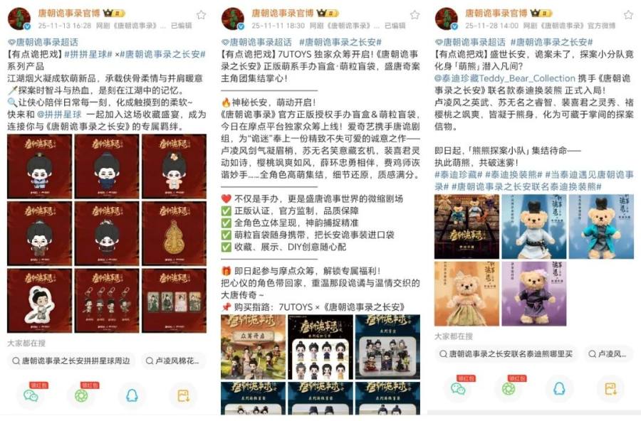 值得关注的是,在谷子文化的热风下,IP衍生品开发也成为系列剧商业开发的重要一环。《唐朝诡事录之长安》上线后,拼拼星球、7UTOYS、泰迪珍藏等品牌与官方IP展开联动,推出棉花娃娃、盲盒萌粒、毛绒换装熊等IP衍生品,超话内,出现大量关于衍生品的内容探讨。