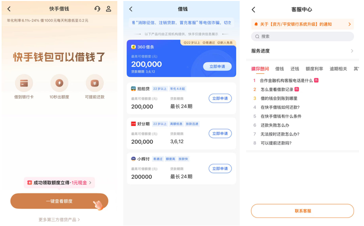 但是当时的快手就上线了借钱功能,只不过是由第三方金融机构来承担,也就是现在的快手借钱里第三方借贷产品,本质就是快手担任着借贷“平台中介”的角色。