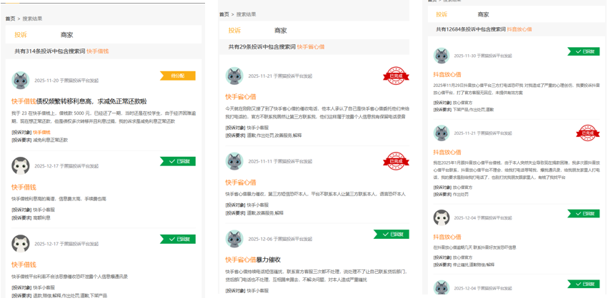 当然,这也不是快手一家出现的现象,例如抖音很早推出的放心借,在黑猫投诉词条更是积累超1万条词条,还有美团小贷在黑猫投诉也超过了500条词条等。
