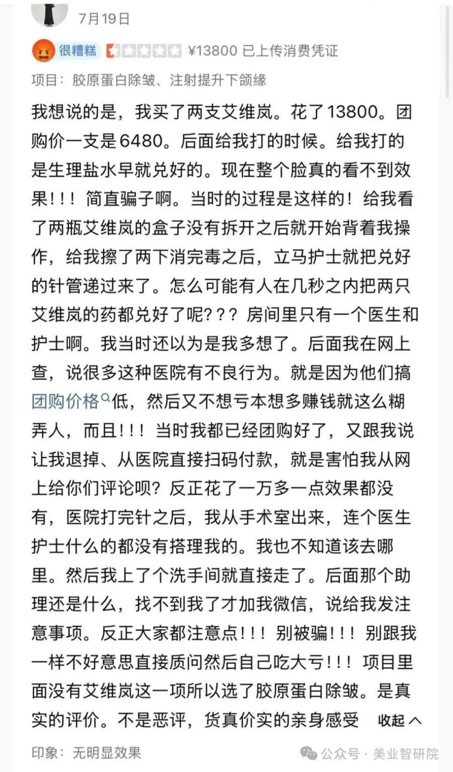 在宣传推广中,他们将一些医美项目的功效吹嘘得神乎其神。比如,一位消费者花13800元团购两支艾维岚,院方先展示未拆封药盒,却在消毒后“秒递”已抽吸好的针剂,两支童颜针正常需现配现溶,几秒完成有调包生理盐水之嫌。