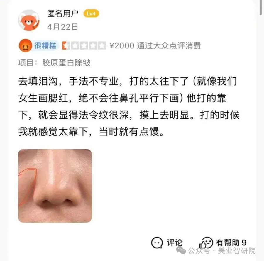 一位消费者在大众点评上哭诉,在北京佳彦悦己医美填泪沟时,医生注射位点过低,相当于“把腮红画到鼻孔平行线”,即刻出现馒化鼓包,并因容量下移反衬法令纹更深,触摸可及明显硬棱。